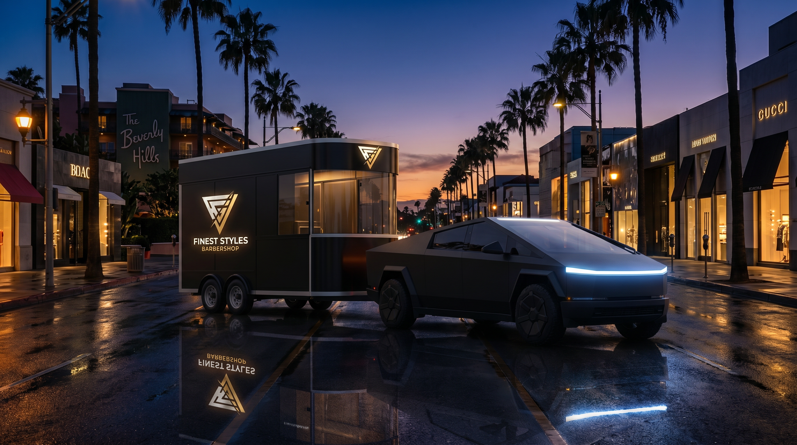 A custom-built luxury trailer pulled by a Tesla Cybertruck. Glass walls, marble floors, a white tufted gold barber chair, and a gold-framed mirror. The interior rivals any five-star grooming suite.